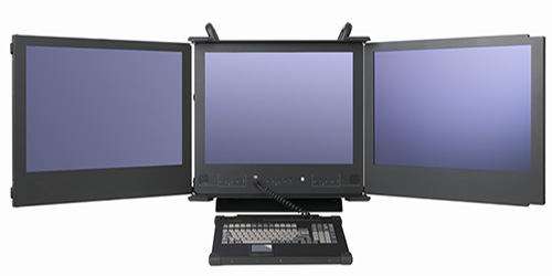 The Apollo-A7 is a three screen portable pc unit offering a standard atx format setup with shock mounted rubber corners and utilizes (3) 23" 1920x1080 HD resolution LCD displays