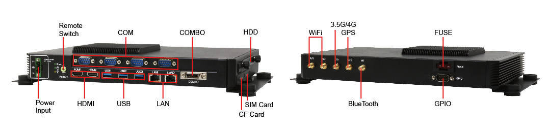 2 x Mini PCIe (For Optional 3.5G / Wifi module only) GIPO: 8-bit GPIO (4 In, 4 Out) Antenna: 1 x SMA for GPS, 1 x SMA for 3.5G, 2 x SMA for WiFi, 1 x SMA for Bluetooth SIM Slot x 1, SIM card changeable without opening case Security: Support I-Button for driver ID CAN BUS: Support CAN 2.0A/2.0B protocol |